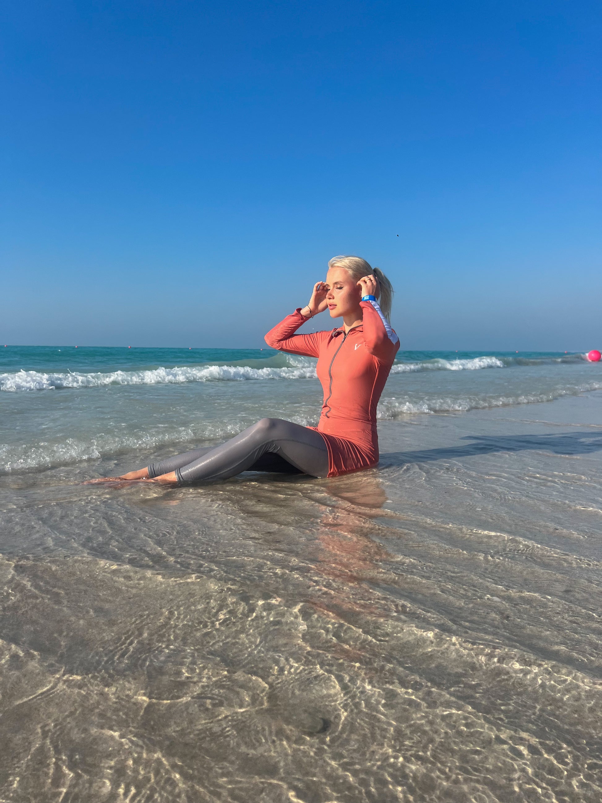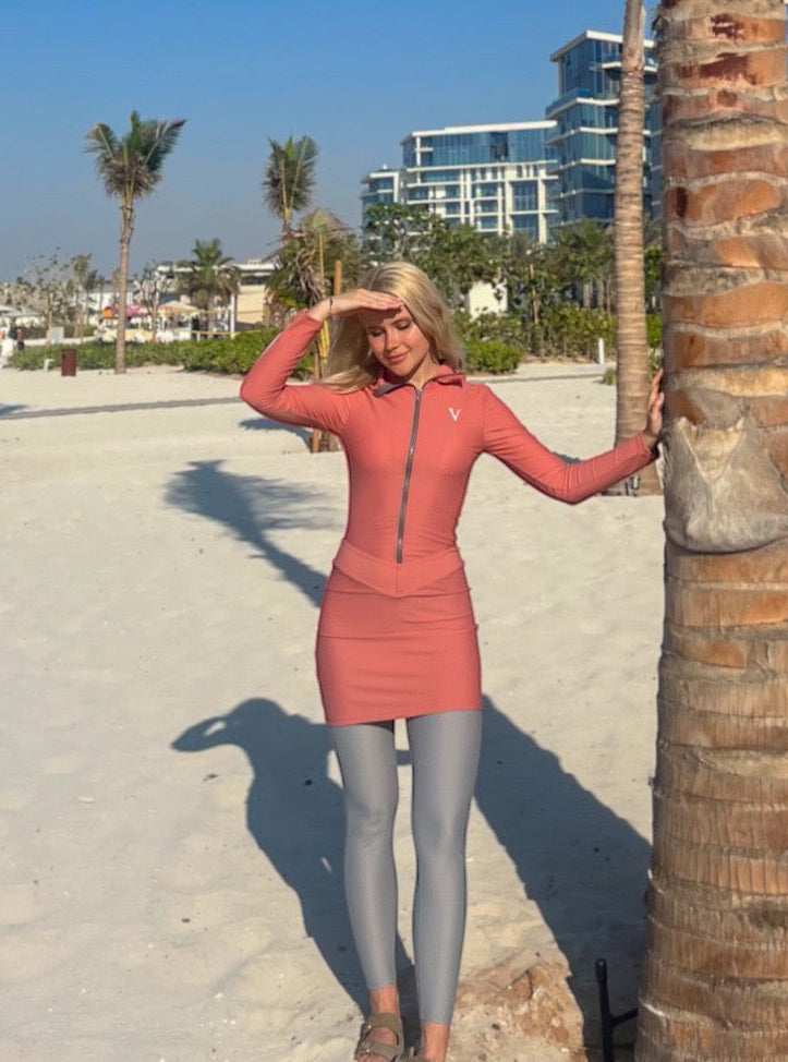 Modern modesty meets sleek functionality in this terracotta swim tunic set. Designed with a slim, athletic fit, this long-sleeve swim dress features a front zip and contrast white piping along the sleeves for a sporty finish. Paired with high-stretch, full-coverage grey leggings, this look offers confident coverage without compromising movement. Both pieces are made from a breathable 85% nylon, 15% spandex blend, providing just the right amount of stretch, structure, and quick-drying performance for all-day wear.